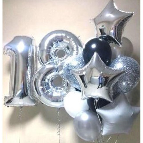 2 figurky 90 cm., 3 foliové hvězdy, 2 kuličky s konfety, 5 latexových míčků se zpracováním. Latexové balóny se zpracovávají na dlouhý let (3-10 dní), fóliové balóny létají od 7 do 20 dnů.
